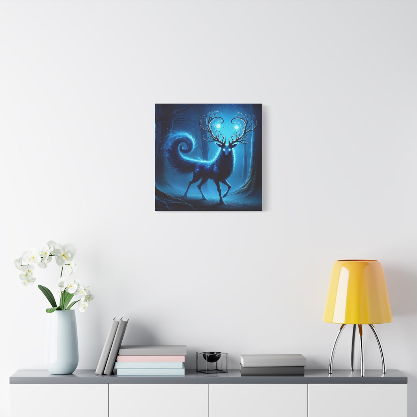 للمعجبين بفن الأساطير: غزال سحري يتألق بطاقة كونية زرقاء في غابة غامضة مليئة بالأسرار