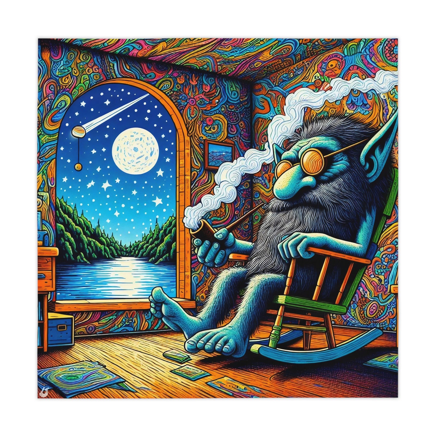 يعرض المنتج مخلوقًا مستوحى من الفن السيكاديلي. استمتع بتصميم سريالي نابض بالحياة يجمع بين الواقع والخيال في مشهد كوني ملون. اشترِ الآن!