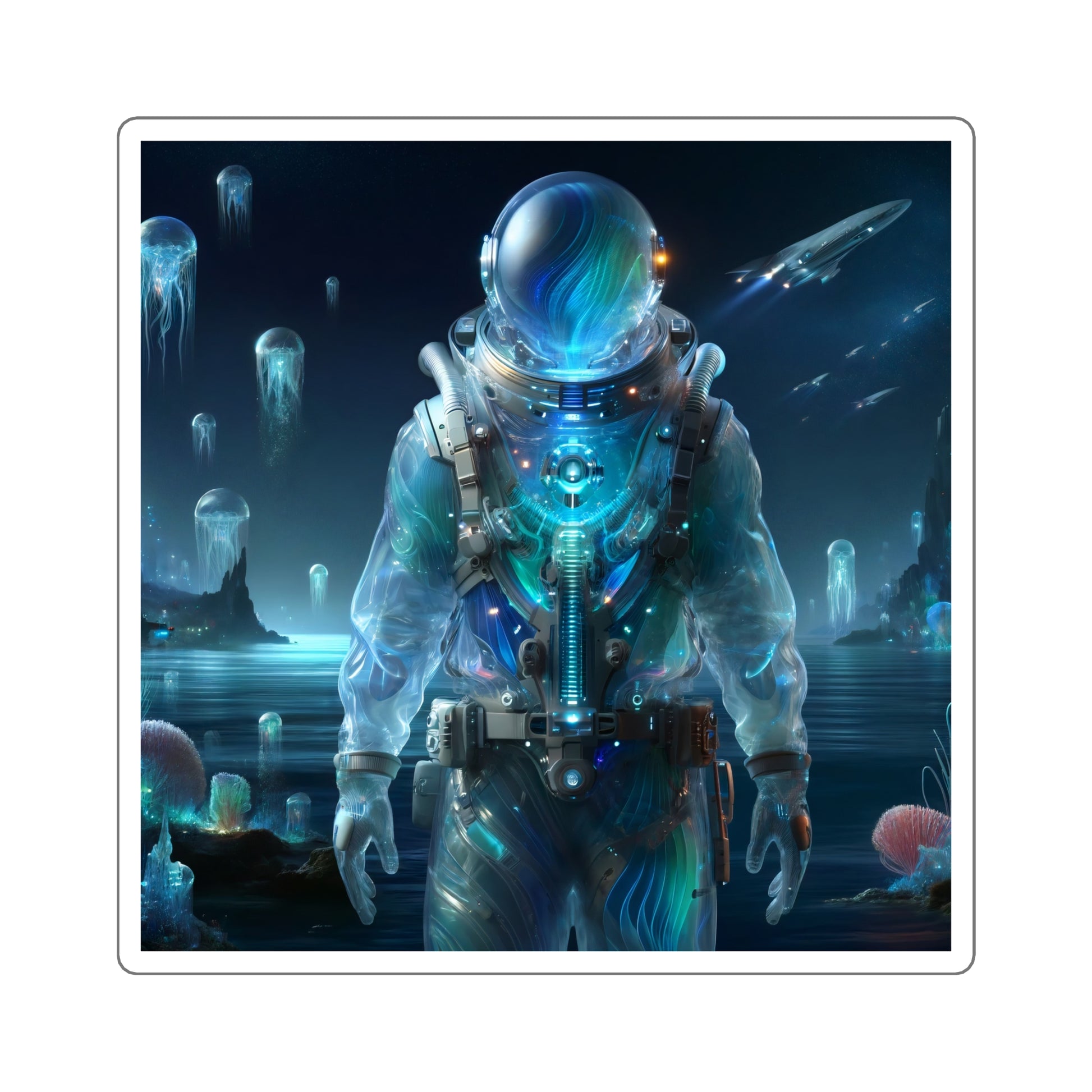 El producto presenta un astronauta inspirado en la ciencia ficción acuática. Exploración submarina alienígena con tecnología bioluminiscente avanzada. ¡Compra ahora y viaja a otros mundos!
