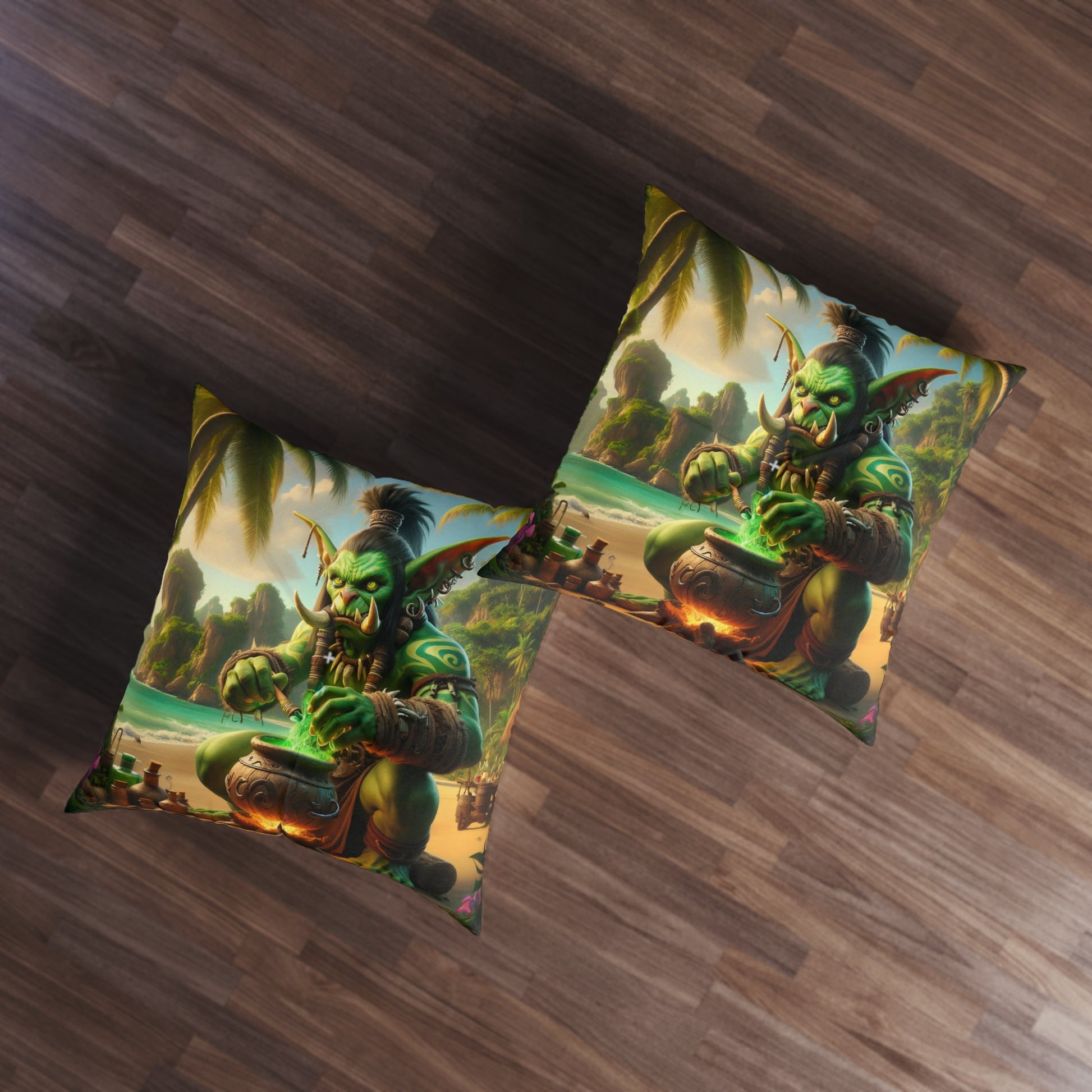 열대 해변에서 마법의 물약을 만드는 오크 주술사를 특징으로 합니다. 신비로운 부족 판타지 요소가 돋보이는 독특한 열대 섬 장면을 지금 구매하세요.